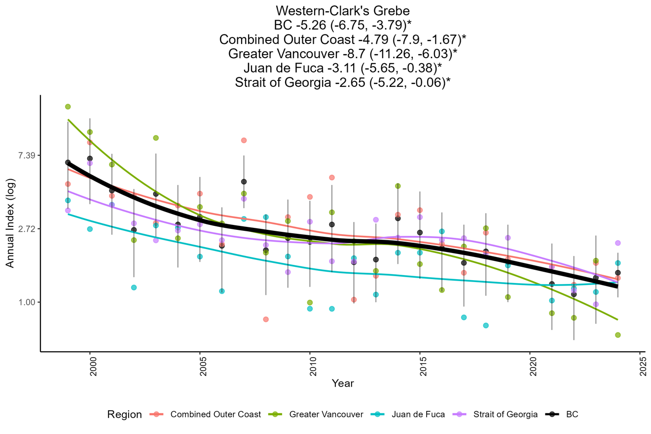 In summary, the key message is that Western Grebes, as well as the populations of several species of sea ducks are progressively disappearing from our coasts. Also, as expected, the Greater Vancouver area and Strait of Georgia require particular conservation attention. These results will continue guiding future research collaborations and conservation planning.