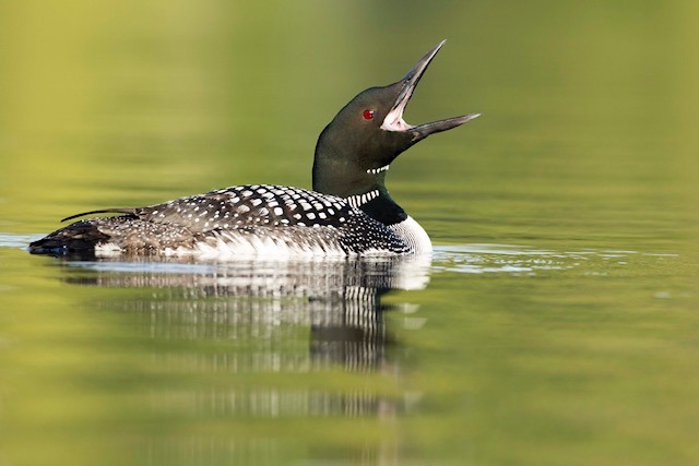 Common Loons often return to the same lake year after year. Despite being conspicuous while out on open water, they tend to be secretive around their nests, which are located along the shore. It is the male rather than the female that chooses the nest site, for reasons that remain unclear. Both members of the pair put great effort into caring for and protecting eggs and young, although females incubate more than males. Both mates also aggressively defend against other loons, waterfowl, and other wildlife that compete for their main prey: fish.