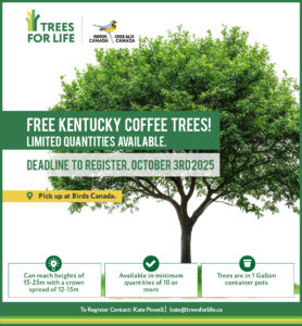 Calling all native plant enthusiasts! Have a property that can host 10 trees? Sign up for FREE trees by registering with Trees For Life. Contact Kate Powell, kate@treesforlife.ca. Pick up will be at Birds Canada in October, but you must register by October 3!